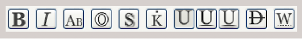 The icons in the middle row leave various «Font Style» options open. From left to right, these are (see Fig. 1.17): Bold, Italic, Small Caps, Outline, Shadowed, Kuromaru (used only with Asian fonts), not Underlined, single and double Underlined, Strikethrough, only words under- or strikethrough. By clicking on the icons, the features are turned on and off. For your normal character, you will hardly need these style features.