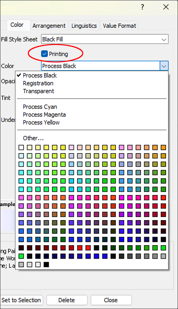 But better create a color and a fill style sheet with this color first. As already mentioned, only with a disciplined style sheet structure is a subsequent change in the entire document simple and quick. – Here it is especially important that the checkmark for «Printing» is set. Otherwise, the most beautiful color cannot appear on the best color printer. Non-printing, i.e., without checkmark, the font remains visible only on the screen, which can be very useful for explanations in stationery pads.