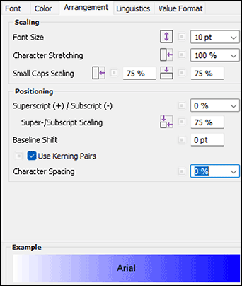 With the «Arrangement» panel (Fig. 1.19), you can set the font size again – also in connection with stretching and other factors. Theoretically, the wildest letter distortions can be produced here, which make every typographer's neck hairs stand up. Use letter stretching and compression only with the greatest restraint! In practice, more important, especially in formula setting and scientific texts, is the super-/subscript and the baseline offset.