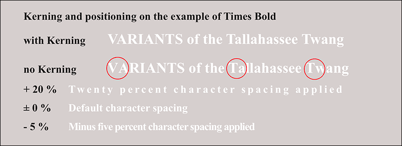 We will go into the baselines in more detail in section 1.5.5 “The fixed baseline”. The property «Use Kerning Pairs» should basically be activated. It helps your text to a more balanced typeface by reducing the otherwise too large distances between A, L, T, V, or W and the following letters, e.g., in combinations like «VA», «Ta», or «tw» (see Fig. 1.20). The letter spacing changes the tracking of the font, i.e., the spaces between the individual characters, but not their width. A specification deviating from 0 thus leads to expanded or condensed text. The typographer speaks of spacing, kerning and/or kerning (see Fig. 1.20 below).