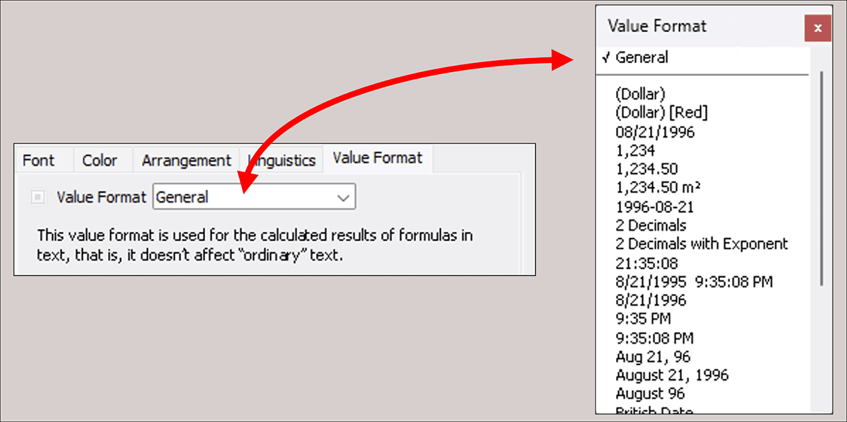 The format «General» is automatically adopted in every new document. All other value formats present in the auxiliaries document are also always available and are listed in the edited document as soon as used. There they can also be changed.