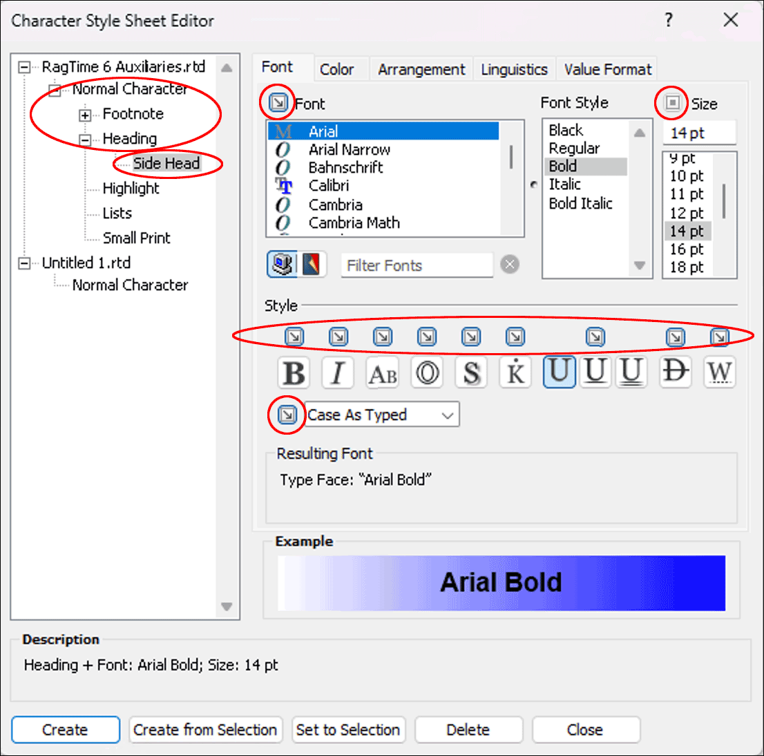 In the «Character Style Sheet Editor» window, a style sheet must be selected to be able to make the corresponding settings for it. The formatting specifications of each style sheet are grouped in five panels: «Font», «Color», «Arrangement», «Linguistics», and «Value Format» (see Fig. 1.15 top right). On the Mac, the names of the panels are unfortunately severely mutilated due to lack of space. But you will soon know how to get to a certain setting.