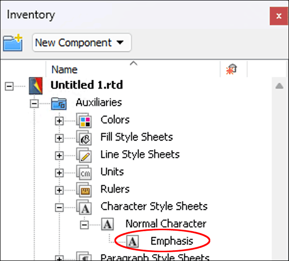 Let's return to the Inventory for a moment. If you have defined style sheets for a document, these are listed in the auxiliaries folder of the Inventory in the corresponding category. As long as you have only worked with the normal character in a document, only this style sheet is displayed there.