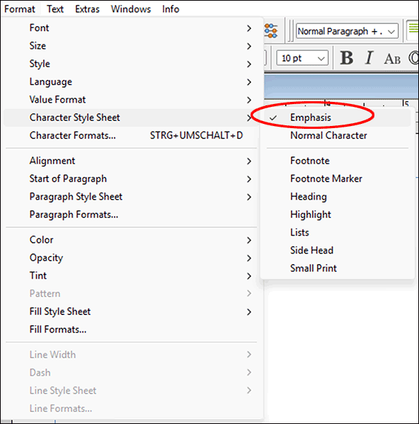 If this is not desired, create a new style sheet with «Create from Selection». Now you only need to properly integrate it into your style sheet hierarchy, set the inheritance dependencies correctly, give the new style sheet a name, and everything is in good order again. If you had not previously selected the entire individually formatted text passage, you must do so afterwards and assign the new character style sheet to it.