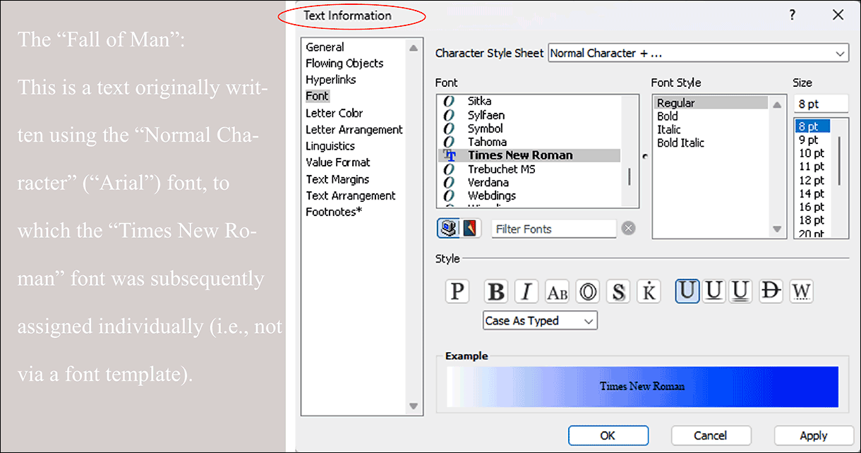 What you change in the «Text Information», however, is saved for the selected text as a deviation from the character style sheet. When changing the character style sheet, such separately determined font characteristics remain. This often leads to misunderstandings. Therefore, once again: Preferably always use character style sheets.