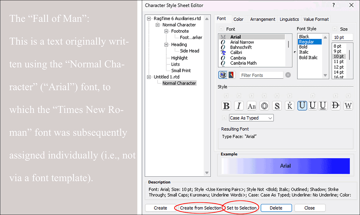 But RagTime 7 forgives your sin! You can easily transfer the individual font formatting afterwards into a “proper” character style sheet: Select the text passage by overwriting or multiple click, or click somewhere in the individually formatted text. Then open the settings window for character style sheets (e.g., with «Windows ➝ Auxiliaries ➝ Character Style Sheet Editor»). With the button «Set to Selection», you adopt the made settings as a change of the style sheet assigned to the selected text passage (see Fig. 1.27).