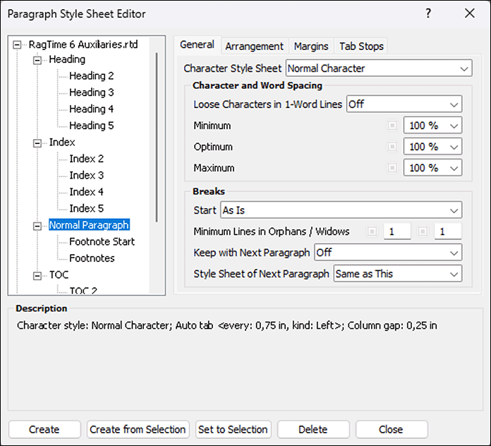 The paragraph style sheets include all settings that influence the appearance of the entire text (beyond the typeface). So properties such as justified or ragged right, indents, tabs, line spacings, baseline grid, etc. The «Paragraph Style Sheets» panel (Fig. Fig. 1.28) shows under «General» the predefined style sheets in RagTime («Auxiliaries») as well as the standard style sheet for the document («Untitled»).