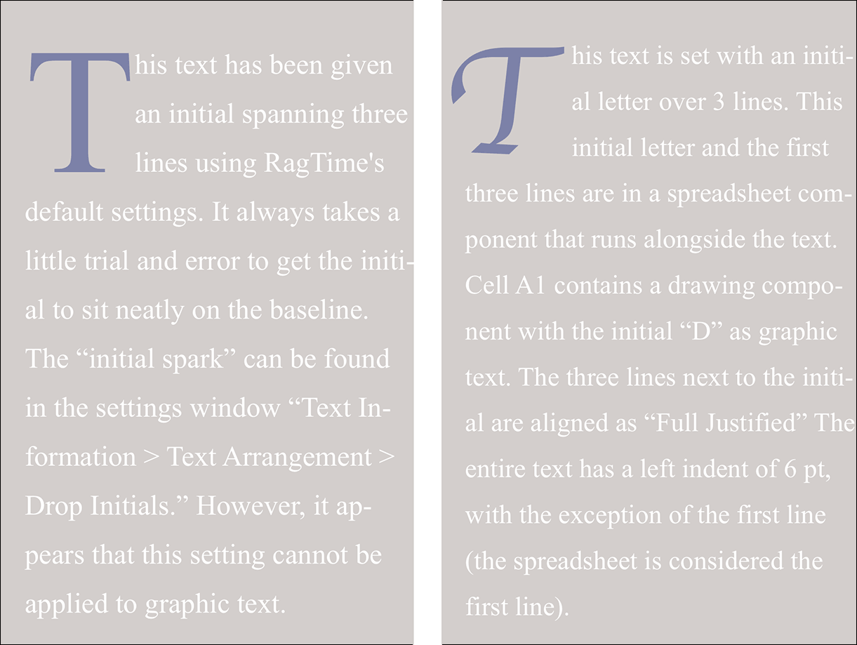 In some texts, especially in fiction, initials (initial letters several lines high) can be very appealing. The handling of initials in the paragraph formats of RagTime 7 is not exactly the best. It takes a few quiet minutes to achieve a satisfactory result. Depending on the font, aligning to the baseline and to the left text axis is quite tricky. Also, the initial cannot be formatted separately in the paragraph style sheet, this must be done manually each time. The initial example created on the left in Fig. 1.29 is nevertheless created with the “on-board” means of RagTime, the one on the right consists of a flowing spreadsheet frame (with the initial in A1 and the first three lines in A2. Paragraph style sheet: First line (corresponding to the spreadsheet frame) without indent, remaining lines with indent.