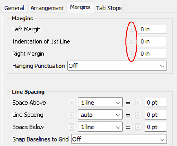 A borrowing from typography is the function «Hanging Punctuation». With certain fonts, punctuation can create unsightly gaps at the beginning and end of lines. If the optical margin alignment is «On», this causes all punctuation, quotation marks, and hyphenation marks to protrude slightly beyond the container edge. We have used this function in this book. If you look closely, or place a ruler on the text edges, you can verify it. Under «Line Spacing», you set the distance between the lines and the paragraphs, either in number of lines or as an absolute measure. Preset is «Space Above = 1», «Line Spacing = Auto», «Space Below = 1» (see Fig. 1.30).