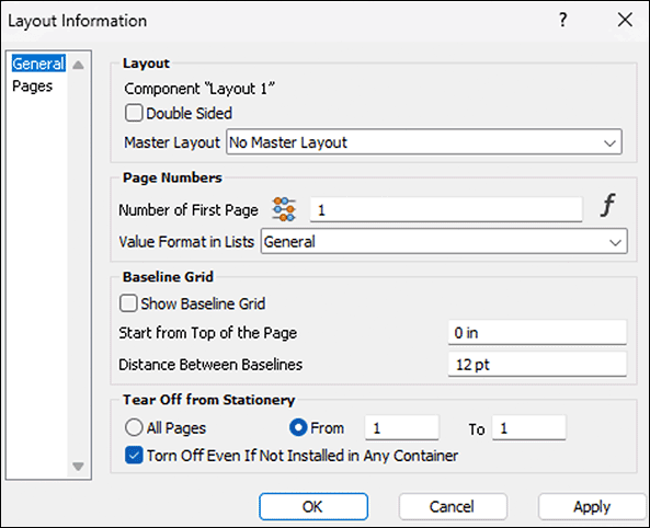 A short excursion into the application: Fig. 1.31 shows the «Layout Information» panel. You call this up most easily by double-clicking on the page tab of a layout page. On the panel, under «Baseline Grid», three options are available. On the one hand, the checkmark to display the baseline grid in the layout. When setting up a layout, this is definitely useful. During the subsequent work, it is rather disturbing to have all layout pages full of lines. If you want to turn the display of the baselines on and off frequently, leave the formatting palette open and click on the icon