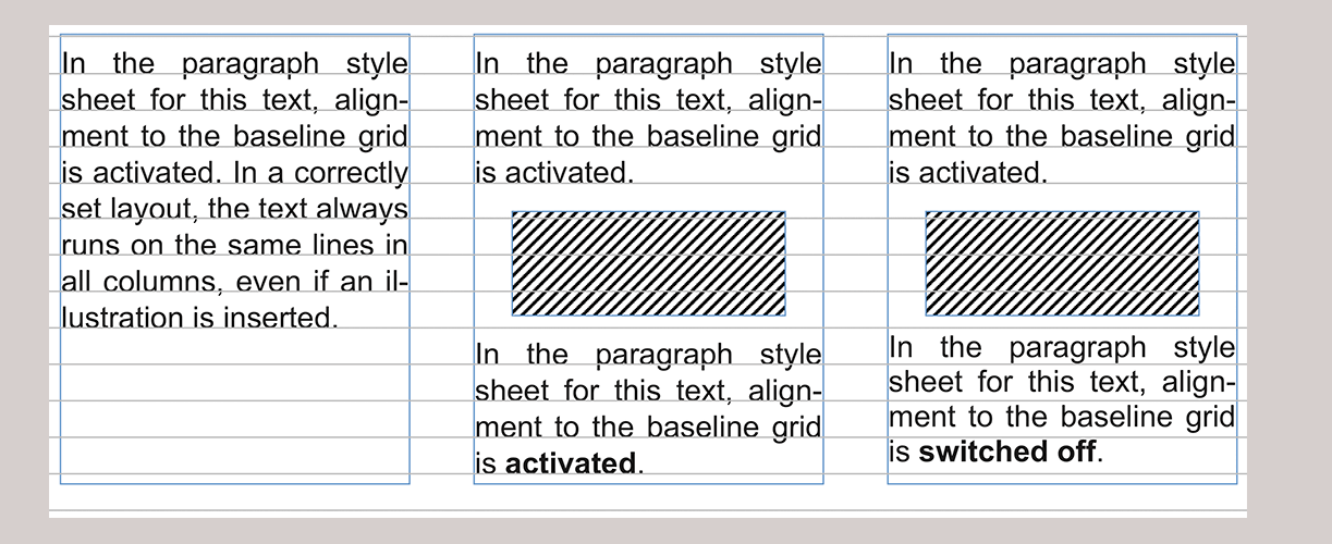 It is always useful to activate the «Snap Baseline to Grid» option when you are using multiple columns side by side and want to ensure that the lines in all columns are exactly at the same height even after inserted illustrations. In the present book, as in almost all normally set books, this is the case (the printer or typographer speaks of “keeping register”).