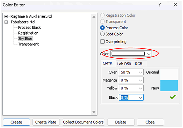 When deleting color style sheets in the Inventory, it is noticeable that – in contrast to other style sheets – no warning message appears. The delete key >/> is therefore to be used with caution. Only with the pre-installed color style sheets of RagTime is there an error message. These RagTime primary colors, i.e., «Registration», «Transparent», and the four process colors, cannot be deleted at all.