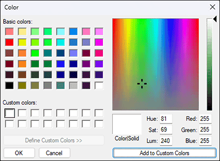 In addition to simple fills, those with two colors can also be defined. For the fill types «Gradient» and «Pattern», the background color is to be specified additionally in each case. The setting for foreground and background color is done with the same means as with the simple fill. The switching between the settings for the two colors is done by clicking on the overlapping squares at the top left.