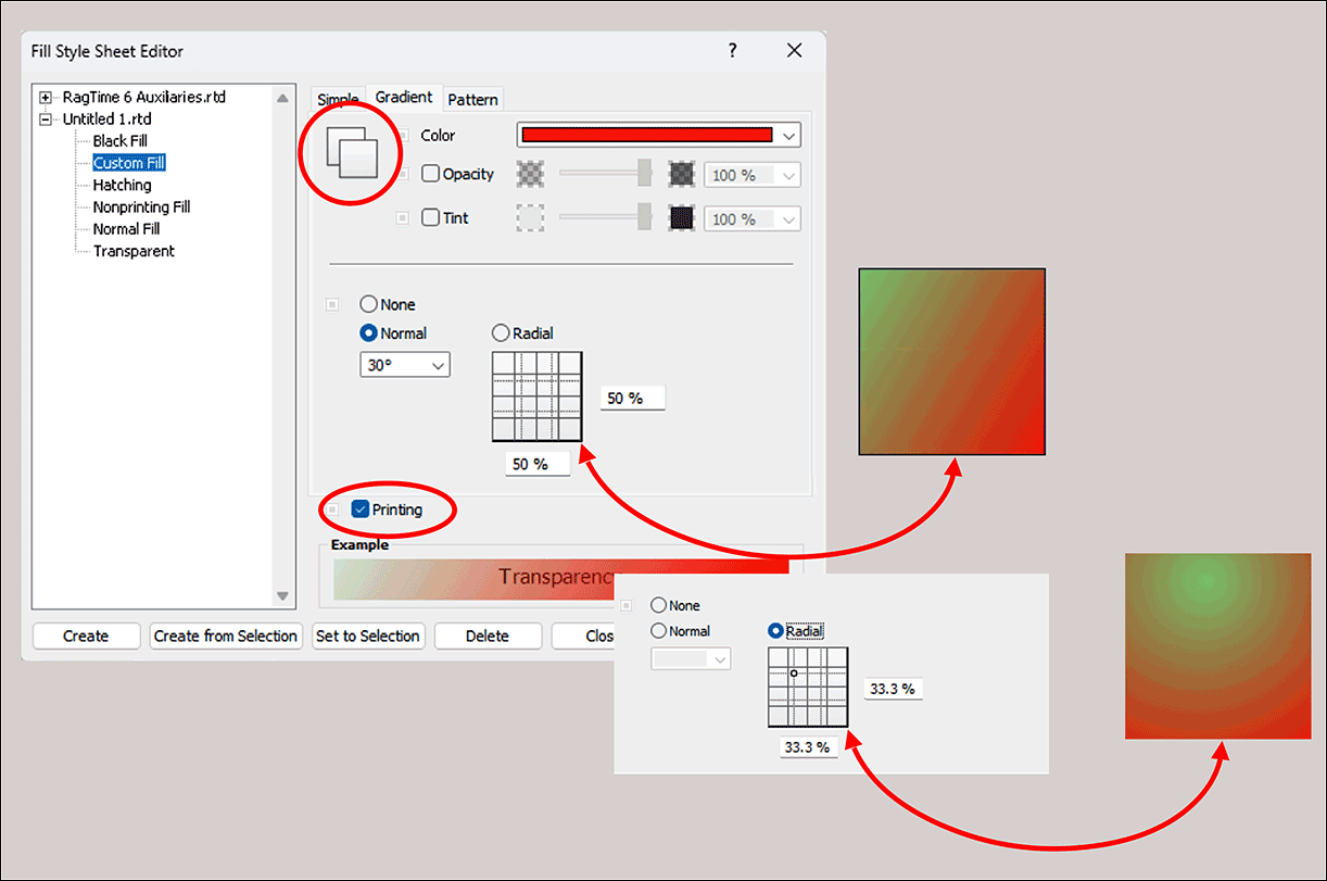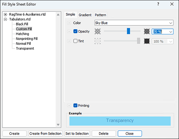 It almost seems as if “double sewn” here. Fill style sheets often only adopt a just defined color. But since only fill style sheets and no color style sheets can be called in individual formattings, this “detour” is necessary. For fills, however, the transparency (called «Opacity» in RagTime) and the «Tint» (brightness) can additionally be preset, in steps of 10% with the pop-up menu, finer with the slider or numerically. At the bottom, you can also set whether areas with this fill style sheet should be printed at all or not. Nonprinting fills are used for comments and their backgrounds that are only of interest on the screen, but not in print.