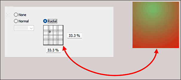 Gradients can be arranged linearly («Normal») or «Radial». For linear gradient, the angle of the gradient direction can be specified. At 0°, the color runs from left (foreground) to right (background). The specified angle gives the rotation clockwise (see Fig. 1.39) For radial gradient, the position of the center (foreground) within the filled area can be specified in percentages of the object dimensions (see Fig. 1.40). In the «Pattern» category, one of the predefined standard patterns can be selected. In the square on the right – or on the command «Other…» in a separate window – you can change the pattern, pixel by pixel. However, the repetition rate cannot be changed. The pattern is limited to the area of the square. Pattern and gradient cannot be combined.