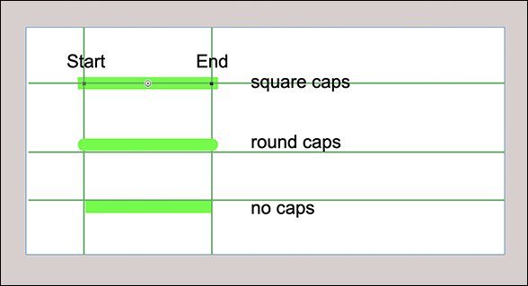What immediately stands out: to preset the color of a line, a fill style sheet must be selected. In contrast to lines in drawings or in the layout, a color or color style sheet cannot be assigned directly. This forces you to adhere to the discipline and systematically define first a color style sheet, based on it a fill style sheet, and finally a line style sheet. The position of the line is not only relevant for the border of objects, as one would actually assume, but places the entire line width also for simple lines left or right of the line axis. – With «No Caps», a line reaches exactly from the beginning to the end of the line. You read correctly: Lines have a beginning and an end. This is not only important for assigning arrowheads, but also for specifying the coordinates. With «Round Caps» or «Square Caps», lines extend by half the line width beyond the endpoints (see Fig. 1.41).