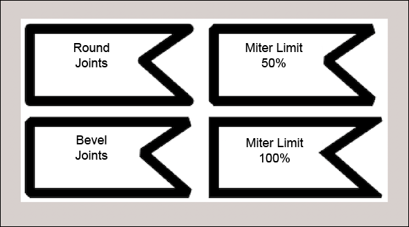The joints are important for polygons and all frames. «Beveled» and «Rounded» correspond to expectations. With «Sharp Joints» and a «Miter Limit» of 100% – this is the default – the corners are sharp. If you have special wishes, experiment with the percentage specification for the «Miter Limit» of a very wide line, e.g., 30 pt (see Fig. 1.42). This way, the effect of a certain specification is most recognizable.