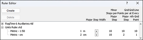 Based on this unit, a ruler can also be defined. Let's call the new ruler «Metric – 1:50» (see Fig. 1.45). The «Major Step Width» is of course «1 m». This specification determines the numbers displayed in the layout ruler and all coordinate specifications. The specification for «Minor Steps per Major Step» concerns the number of small ticks displayed between the whole units in the layout ruler. However, this number can also be less than the specification depending on the display scale. Depending on how precisely you want to draw, you should make the specification for the number of grid points. In our example, with the specification «10», a grid point will come every 10 cm, i.e., every 2 mm in the plan at a display scale of 100%. If you specify more grid points, positioning becomes tricky because it requires too much accuracy. Unless you choose a larger display scale when drawing.