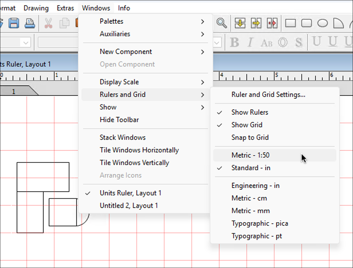 Here a short jump to drawing work with the specifications as explained above, i.e., in scale 1:50. For these specifications to take effect, you must turn on the visibility of rulers and grid in the document under «Windows ➝ Rulers and Grid» and also activate «Snap to Grid». Of course, the just defined ruler must be selected. If you had the object coordinates palette open, you must close it and reopen it so that the correct unit is displayed there. Attention: if you select the item «Ruler and Grid Settings…» all the way at the top in the pop-up menu, a new window opens. In this, you can – even separately for horizontal and vertical – select from the defined rulers as well as activate the visibility and magnetism for the two axes separately. Somewhat unclear in purpose, because not provided with a title, are the dimension specifications in the two input fields at the very bottom. They determine a shift of the grid origin (origin) from the page or drawing edge.