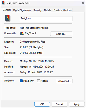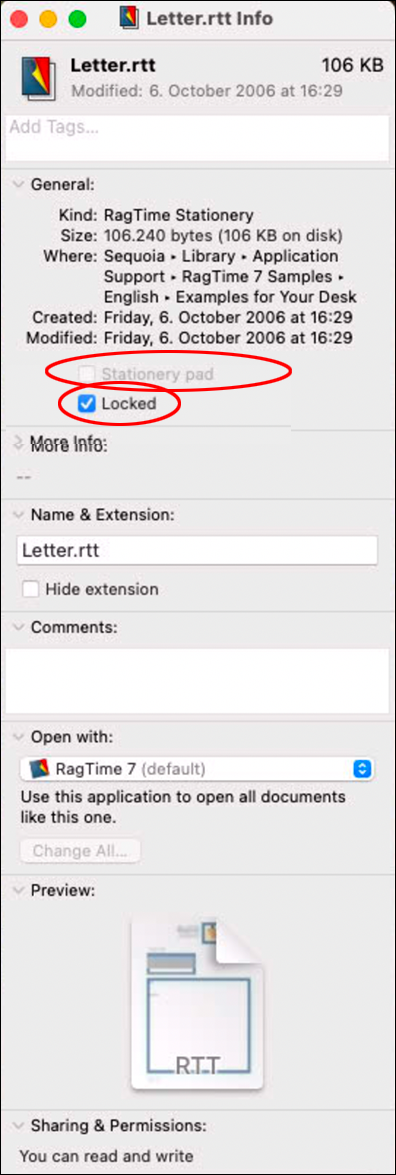 macOS also offers the possibility in the file information (see Fig. 1.47) to designate a document as stationery. This must by no means be used! On the other hand, the document must be protected. Attention: if the stationery pad references another RagTime document, this must also be on the server and protected in the same way. Only then all users connected to the network access can access the form without conflicting with each other. But also in networks with Windows computers, the principle is to be observed that forms must be saved in RagTime as stationery and the pads must be protected on the server (see Fig. 1.48 and Fig. 1.49).