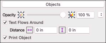 This section (see Fig. 1.52) makes a few important object properties directly accessible: Opacity (transparency), the text wrap, including the associated distances, and printing.