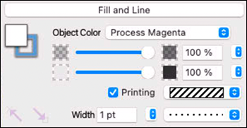 At the top left in this section (see Fig. 1.53), there is a switch for border and fill. Accordingly, opacity and tint as well as a pattern can be assigned. But here too, you can determine whether the chosen should be printed or not. At the bottom, there are setting options for the line: Arrowheads front and back, line width, and dashing.