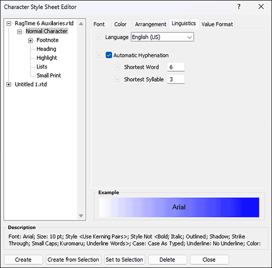 The «Language» pop-up menu is directly related to the installed dictionaries. Select the one that corresponds to your correction and hyphenation mode. The installed language packages of RagTime each contain all variants of a language, so e.g., for German the traditional and the reformed spelling, both in the German and the Swiss version, or the American and the British spelling for English. For the hyphenation, the checkmark «Automatic Hyphenation» is important. Without checkmark, RagTime 7 builds the text without hyphens – with correspondingly large word spaces in justified text.