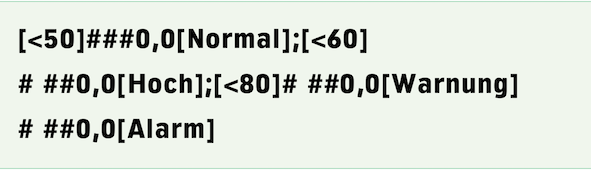 Value formats can contain multiple specifications that are applied depending on the value of the number to be displayed. An example is the format «Dollar [Red]». The first format specification concerns positive numbers, the second negative. Another would apply to the value 0. But you can go much further and define the conditions yourself under which a format specification should be applied. You do this in square brackets prefixed to the format specification. The conditions are checked from left to right for match and the first format with fulfilled condition is applied. The last specification must be unconditional so that a applicable format specification is always available. So you could specify a format according to Formula 1.1 with appropriately defined fill style sheets «Normal», «High», «Warning», «Alarm».