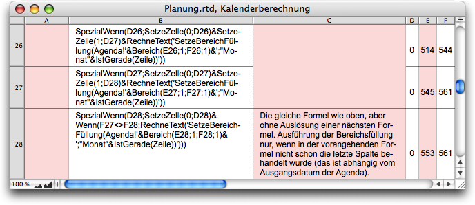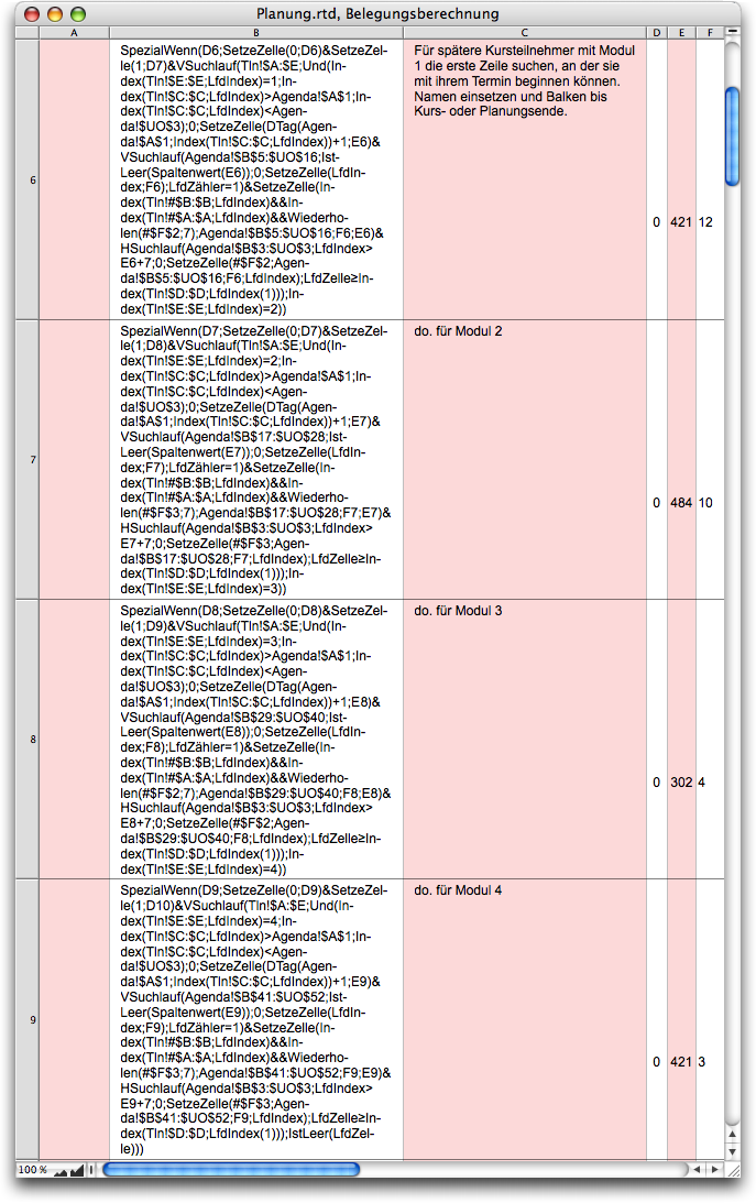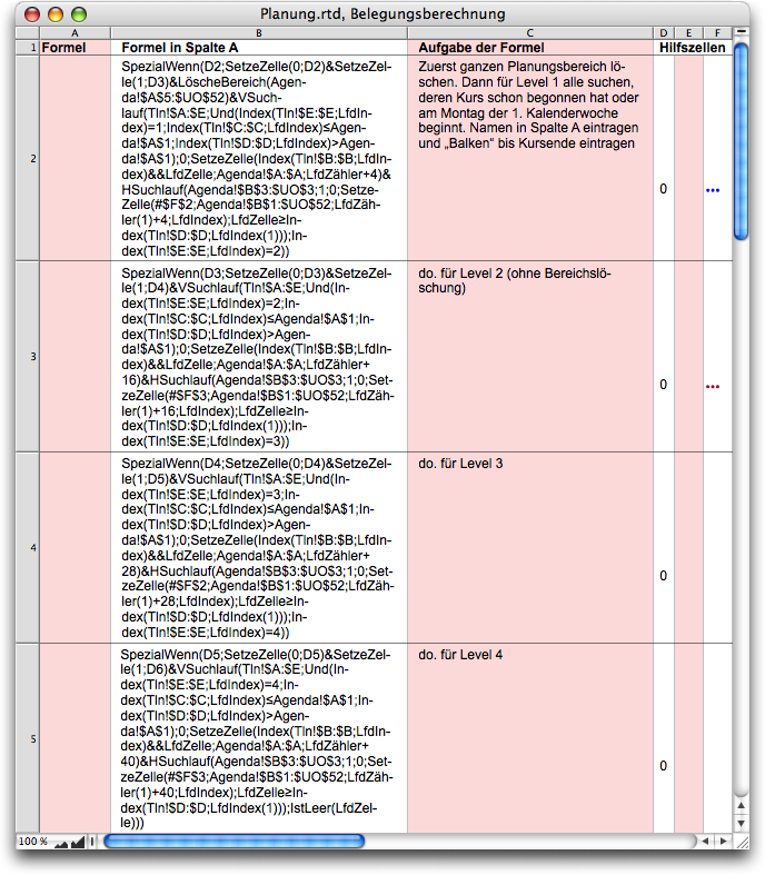 We use the same method as for calculating the calendar dates. The easiest way is to create a copy of the «Calendar Calculation» spreadsheet in the Inventory (simply drag it into the Inventory and hold down the “/6 key while dragging it a little) and name the duplicate «Occupancy Calculation». Of course, we delete the entries from row 2 in column A (formulas) and in columns C:F (comments and auxiliary values). However, we can leave the formulas in column B, which in turn make the formulas in column A visible. These formulas also always start with the lock function «SpecialIf» and the two SetCell commands, which delete the activation and trigger the following formula, again indicated only with «…» in the following formula representations. The first four formulas are shown. During formula creation, a test run can be triggered by setting the “trigger cell” to 1.