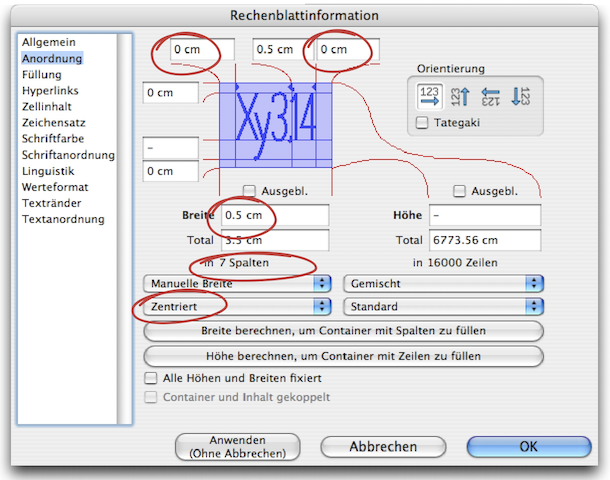 Check the number of selected columns in the «Arrangement» panel of the spreadsheet information (see Fig. 2.139). Set the column width to 0.5 cm, the distance from the cell margins on the left and right to 0, and the horizontal alignment to «Centered».