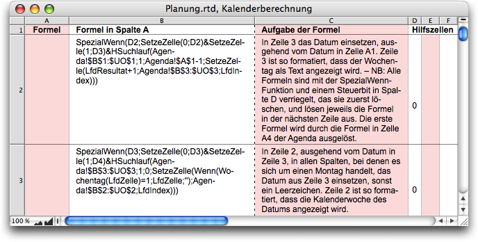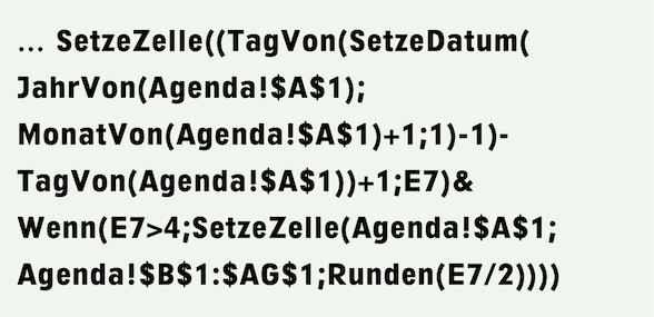 To improve clarity, we create a separate spreadsheet called «Calendar Calculation» for the formulas. However, this means that every reference to a cell or range in the «Agenda» spreadsheet is extended by the component name. It is obvious that we will need a whole series of searches, which we want to place in separate formulas. We use the technique of formula chaining with mutual triggering, which is discussed in detail in the formula chapter “Formulas Part 3: In full swing”.