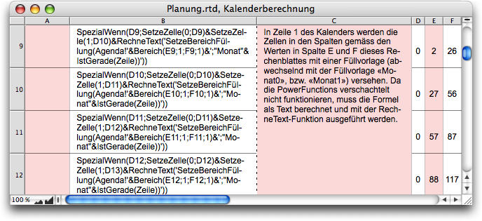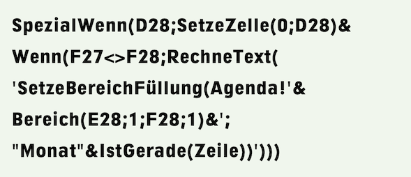 Should we use the «MPFSetRangeBknd» command again, as we did for the month line when creating the calendar? That would be one option. But you may have noticed during testing that the construction with «CalculateText» and the variable areas seems to take a lot of computing time. And we'll soon discover a second reason why we prefer a different solution!