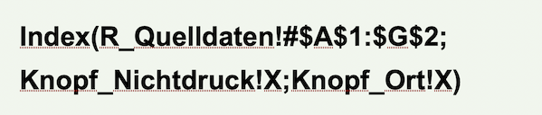 «Index» is the function that delivers the value of a spreadsheet cell from a specific range. The range A1:G2 includes the location names for the watermark in the spreadsheet «S_Source Data». The opened spreadsheet «S_Source Data» is displayed in Fig. 2.17. Row 1, from cell A1 to G1, contains the location designations formatted as printing, row 2, from cell A2 to G2, contains the location designations formatted as non-printing. The remaining contents of this spreadsheet serve another purpose in connection with the letter forms. We will come to that in the next section.