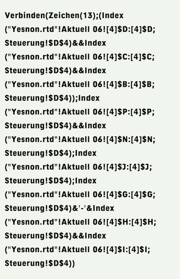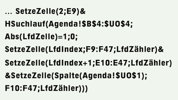 Couldn't all these formulas in rows 10 to 28 be replaced by a single formula controlled by a search? It's possible, but this construction would be so complicated that even experts might get confused. Sometimes it's necessary to assess whether the effort is worth the try. In this case, we decided against it.