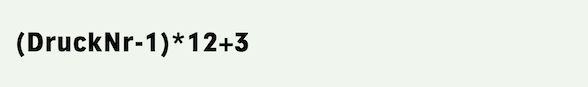 We refer here to the dissected subformulas, although the adjustments must of course be made in the formula as a whole. In comparison with Formula 2.42, the respective level must be used instead of «1». In the two formulas in which 4 was added to the sequential counter, Formula 2.46 and Formula 2.49, this value must be increased by 12 for each level. In Formula 2.48, adjust the reference to the character to be used for levels 2 and 4: row 3 instead of row 2, so that the character matches the background.