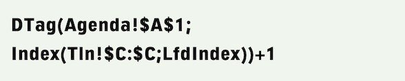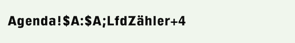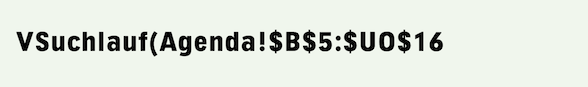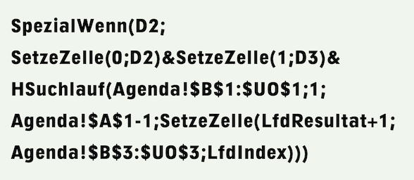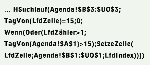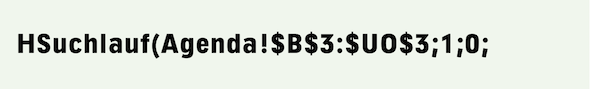 This “standard part” is followed by the horizontal search, for which the range B1:UO1 is specified. This range is solely responsible for ensuring that the HSearch runs across all columns of our calendar. Which row of the spreadsheet is “searched” is completely irrelevant. The execution of the “follow-up value formula” is not subject to any conditions, hence the «1» as the “condition”. The starting value is the previous day (hence «-1») of the date in cell A1 of the «Agenda» spreadsheet. This date is therefore assigned to the value «CurrentResult» at the start of the HSearch execution. In each column traversed by the HSearch, «CurrentResult», i.e. the date, is first increased by one day and then inserted in row 3.