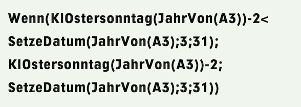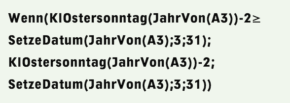 A special case is, of course, Easter Sunday, which can swap places with Good Friday depending on the year. The calculation would always be correct, regardless of whether the days are in the correct or incorrect order in the table. Nevertheless, the incorrect order is unattractive and confusing. Formula 2.28 is entered in the row for the first of the two days and Formula 2.29 for the second.