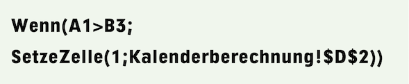 In the «Calendar Calculation» spreadsheet, we use the columns as follows (see Fig. 2.141): the formulas are in column A. The value resulting from the execution of the formula is irrelevant and can only cause confusion. We therefore set the visibility of the cell contents for this column, apart from cell A1, to «nowhere» in the spreadsheet information. In cell B2, we insert a simple formula using the MetaFormula function «FormulaOf». This makes the formula in cell A2 visible in cell B2 (Formula 2.22).