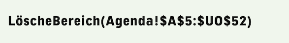In the first step, we want to develop a formula that searches for participants and enters them into the agenda; specifically, participants who are taking a course that has either already started or will start in the first week shown. The latter is the case in the example shown. However, with the right wording, these two cases can be handled together. As you may have guessed, and as you can now see in Fig. 2.148, the formula is not simple. But don't worry, we will go through it step by step. The first line of Formula 2.39 (see Formula 2.40) simply deletes the entire planning area, from row 5, the first row of level 1, to row 52, the last row of level 4, and from column A, with the name entries, to column UO, the last column of the scrolling calendar.