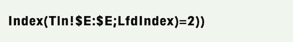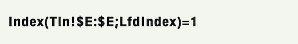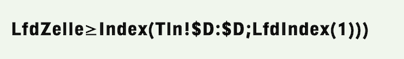A vertical search then controls the whole process. Searched is the participant list «Part». Searched are those entries that correspond to several conditions at the same time, which are linked with «And» (see Formula 2.41). The first of the conditions is that only participants of level 1 are searched, thus rows with the value 1 in column E (see Formula 2.42). «CurrentIndex» always delivers the index to the just examined participant row.