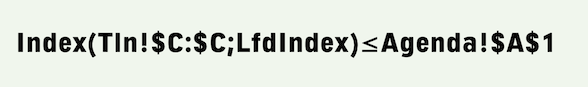 The second search condition is that the course start date must be before or on the base date of the calendar, i.e., the value in column C must be less than or equal to this base date in cell A1 of the agenda (see Formula 2.43). Finally, course participants who have already completed their course should not be included – this is the third condition. Therefore, the end date in column D must be greater than the calendar base date. Hence Formula 2.44. This third condition is followed by the closing parenthesis of the «AND» function. The start value of the search is meaningless and is simply set to 0.