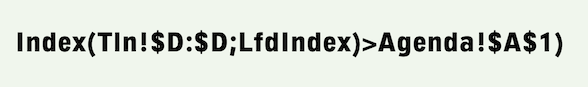 The name must, of course, be entered in column A of the «Agenda» spreadsheet, starting in row 5. Now, our search using the «CurrentCount» function always returns the number of participants already found, i.e., the value «1» for the first participant who meets all the conditions. With the addressing in Formula 2.46, the name is written in row 5 of column A for the first hit, in row 6 for the second hit, and so on.