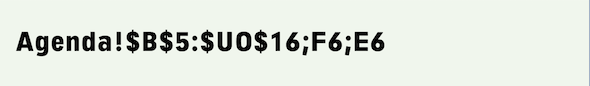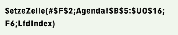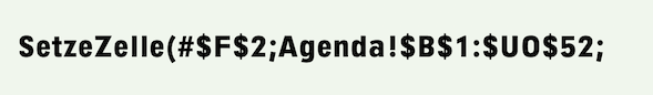 The SetCell command copies the aforementioned character string, including formatting (thanks to the «#»), from the auxiliary cell F2. The entire agenda for levels 1 to 4, i.e., from column B to column UO and up to row 52, is specified as the target range so that this part of the formula does not have to be changed when copying (see Formula 2.48).