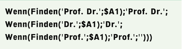 First, insert six additional columns to the right of column A in the newly created spreadsheet «Addresses_Converter» («Spreadsheet ➝ Insert Columns»). As the first step in entering the formula, we search the cells in column A for the prefix, i.e., «Dr.»/«Prof.»/«Prof. Dr.» etc. Since we are searching for clear text segments here, it is important to know all the spellings that occur in this context (for example, an addition such as «Dr. h.c.»).