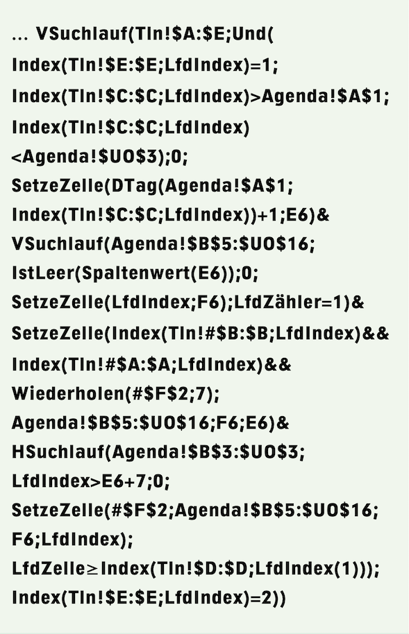 Finally, a critical comment on the formula display in RagTime – certainly appropriate at the end of this formula-heavy section on calendars and planning: it would be very useful if the formulas in the RagTime formula palette could be wrapped, similar to what we have done here. And we have also been wishing for automatic multicolored brackets, always the same color for matching brackets, for a long time! On the positive side, we note the impressive performance of the functions and formulas. Anyone who works through a few exercises will be amazed again and again – but will also come up with ideas on how to solve problems more optimally.