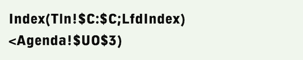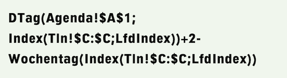 The search is terminated as soon as the date in row 3 of the calendar is equal to or greater than the end date specified for the participant in column D. Here, too, we must take the nesting level into account. And we see that it was correct to define row 3 as the search range for the search. Only in this way could we simply refer to the date in the column with «CurrentCell». The many parentheses at the end of this line close the nesting level of CurrentIndex, the index function, and the horizontal search.