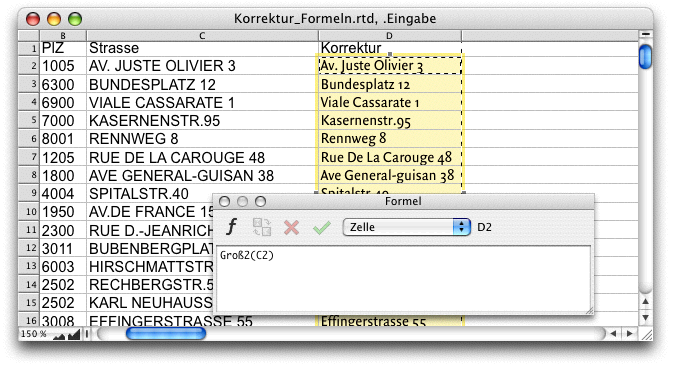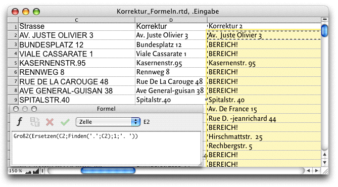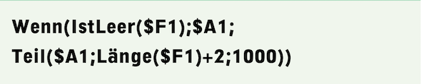 A word of warning: it is very tempting to make changes to the displayed formula rather than the actual formula. You should therefore definitely activate protection for the cells in column B – with «Extras ➝ Protection ➝ Formula Protected» and then «Extras ➝ Protection ➝ Lock Document» – preferably without a password. This makes more sense than simply preserving the formula when entering values, as was done earlier in column A. A formula changed in column B – it is only the display, not the actual formula – would not be checked for correct syntax when entered and would then have to be transferred to column A as the actual formula. – Of course, we copy cell B2 in column B down as far as necessary.