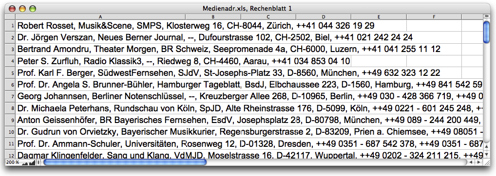 In our exercise, we now continue to assume that the managing director of our school in Munich has sent us a file with interesting addresses of media professionals. He has emailed us an Excel file «Mediaadr.xls.». Upon importing, the usual message appears (Fig. 2.83). But then a rather annoying picture emerges (Fig. 2.84) because the data is written consecutively per row. However, we need it separated. Poorly formatted addresses are a recurring problem. Fortunately, there is still some consistency here, as the individual address components after the name are all separated by commas and spaces. For sorting into columns in our address file, we need a tabulator as a separator between the individual address components.