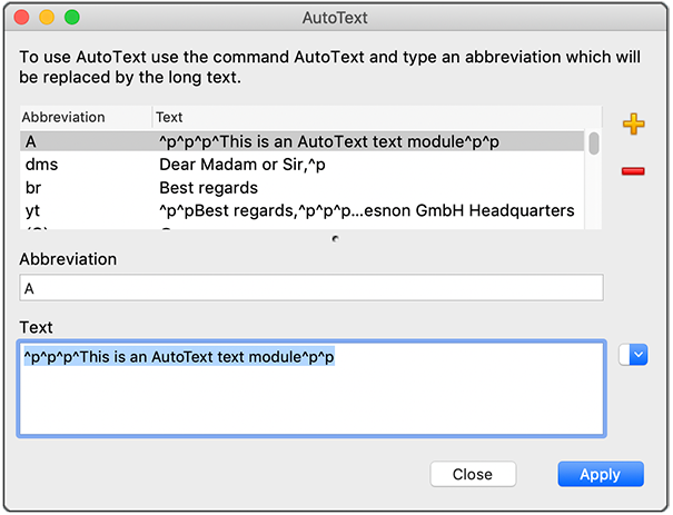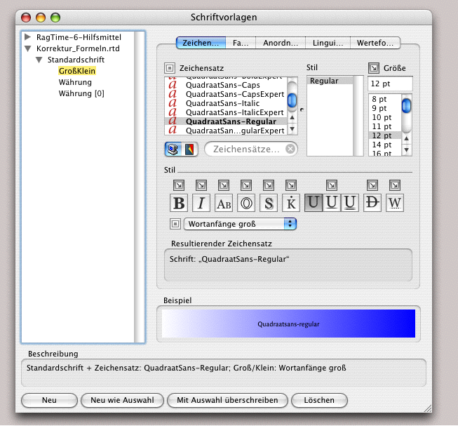 , insert new ones. A new entry always appears exactly above the one that is currently selected in the list. Unfortunately, the list cannot be sorted or regrouped in order. Write your text in the lower field – paragraph marks can be written right along –, and enter a shortcut. Click on the «Apply» button, and the text is immediately inserted there in your existing text where the insertion mark was. – These shortcuts have no influence on the keyboard shortcuts that are otherwise present on your computer or in RagTime, since they are introduced with a prefix.