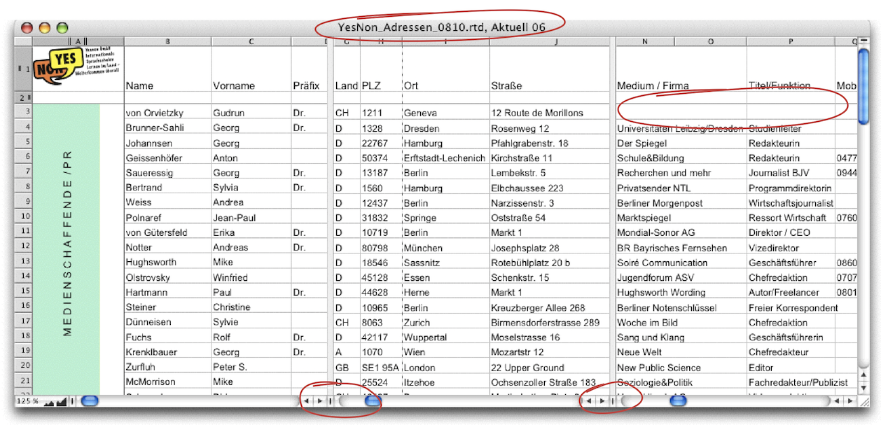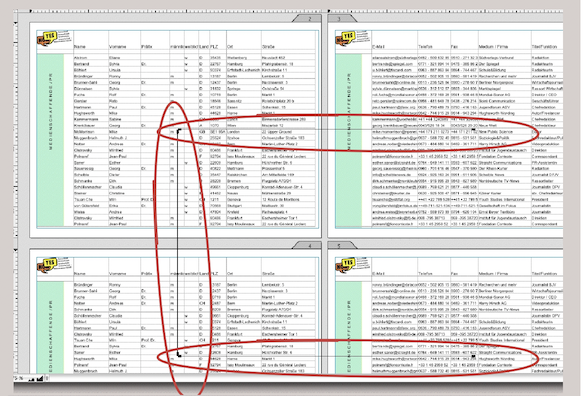Fig. 2.77 shows a spreadsheet in which the respective address groups are contained in different planes. Plane 1 contains all internal addresses of the YesNon schools, plane 2 all students, plane 3 all partner companies, and plane 4 contains the public relations addresses with the journalists and media professionals. The spreadsheet is designed with headers (title rows) and margin column (title column).